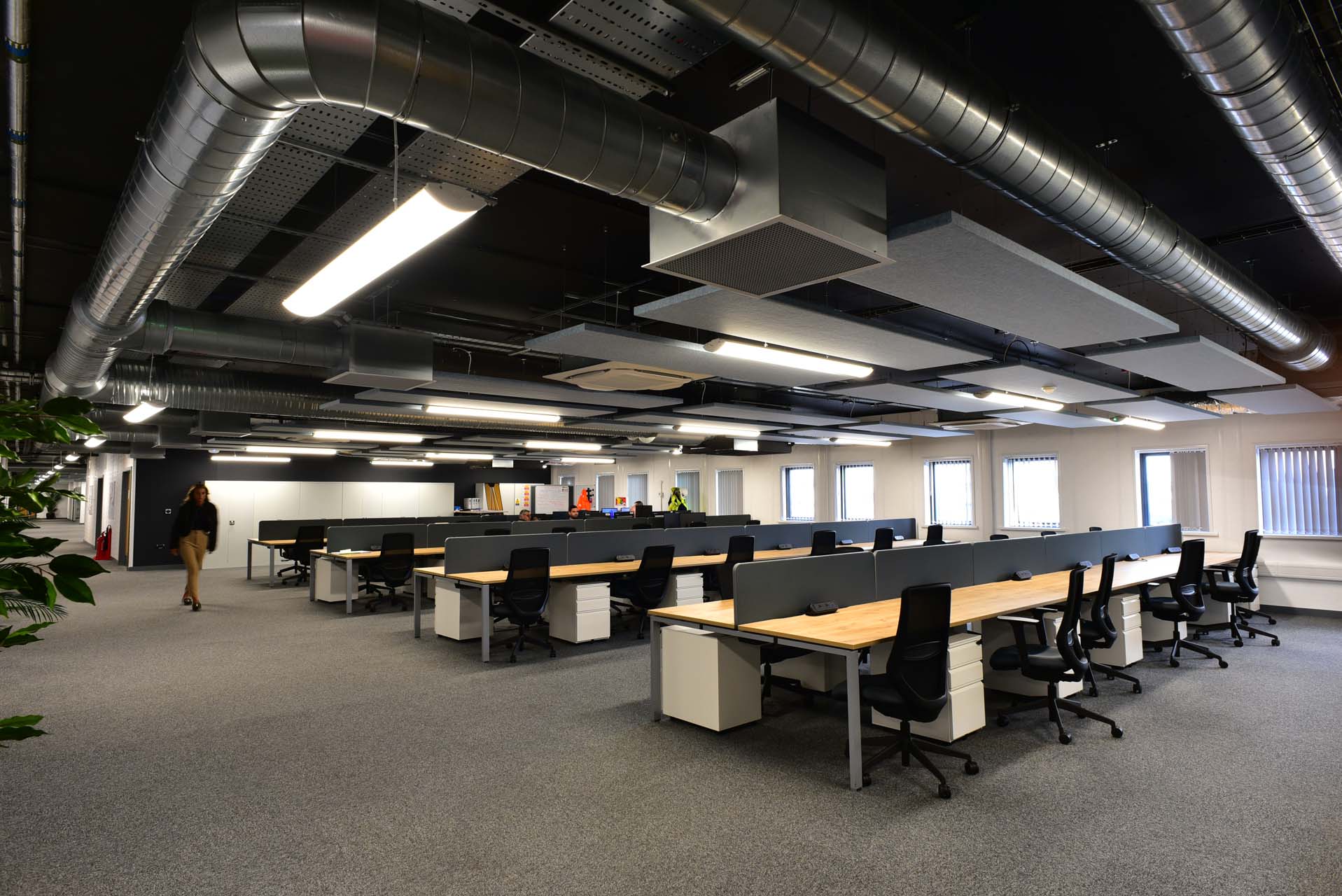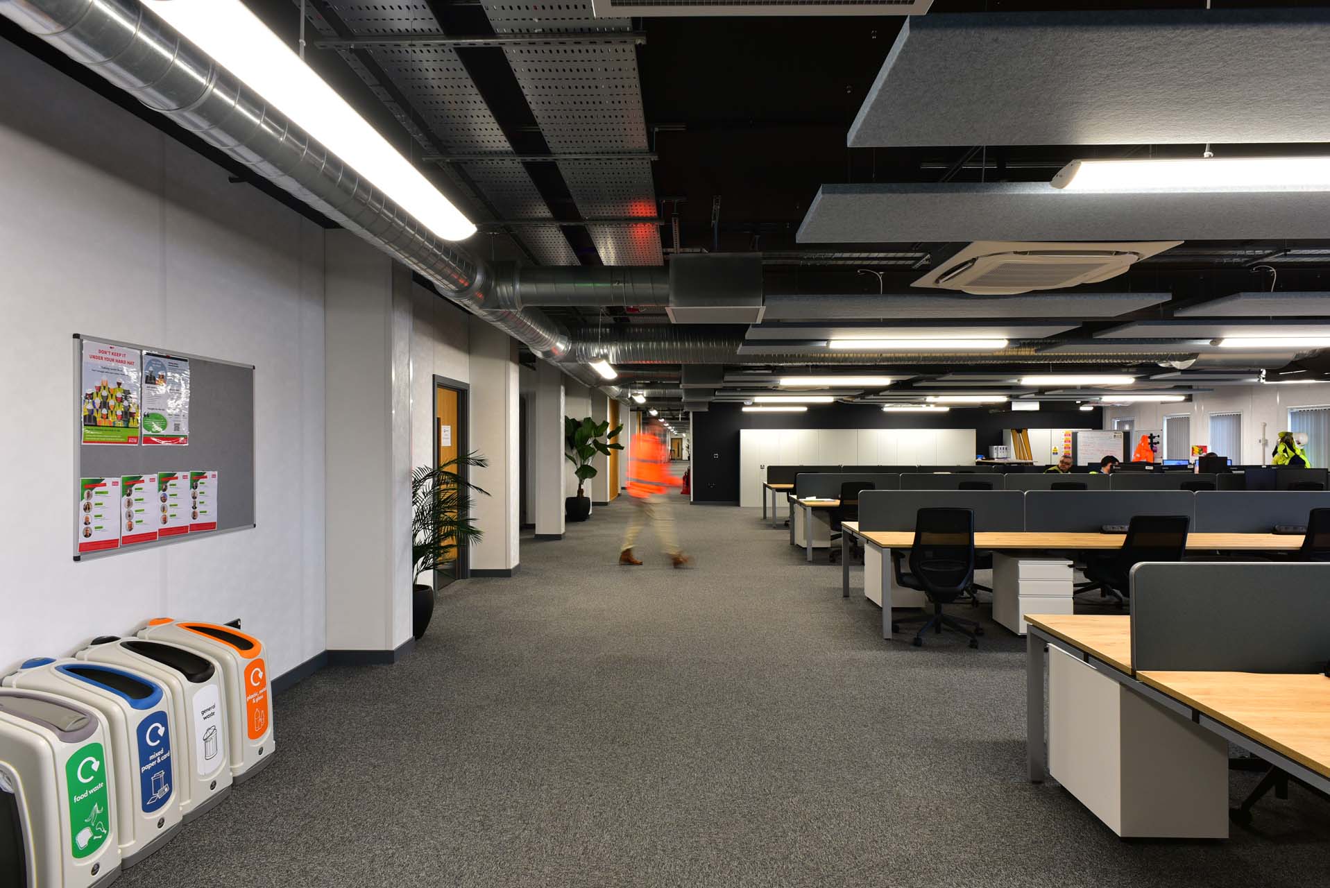 - Features: Reception area, open plan office areas, various size meeting rooms, breakout areas, induction room, occupational health area, showers and lockers, toilets
