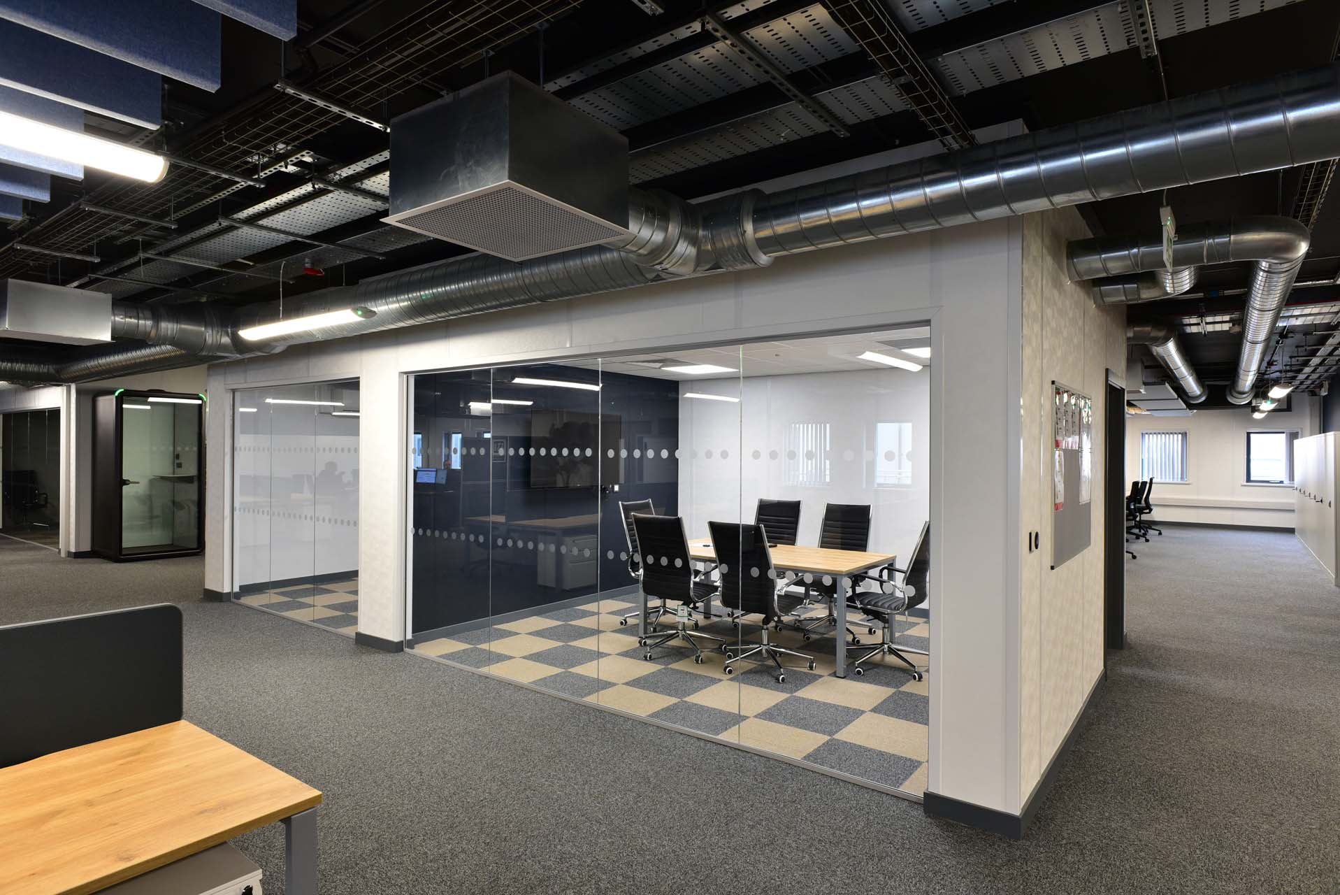 Building 2 provided additional office accommodation, including open-plan workspace, a range of meeting rooms and a large boardroom with integrated sliding partitions to allow flexible use of space. Supporting facilities such as breakout areas, reception spaces and welfare provision were incorporated to create a functional and efficient working environment.