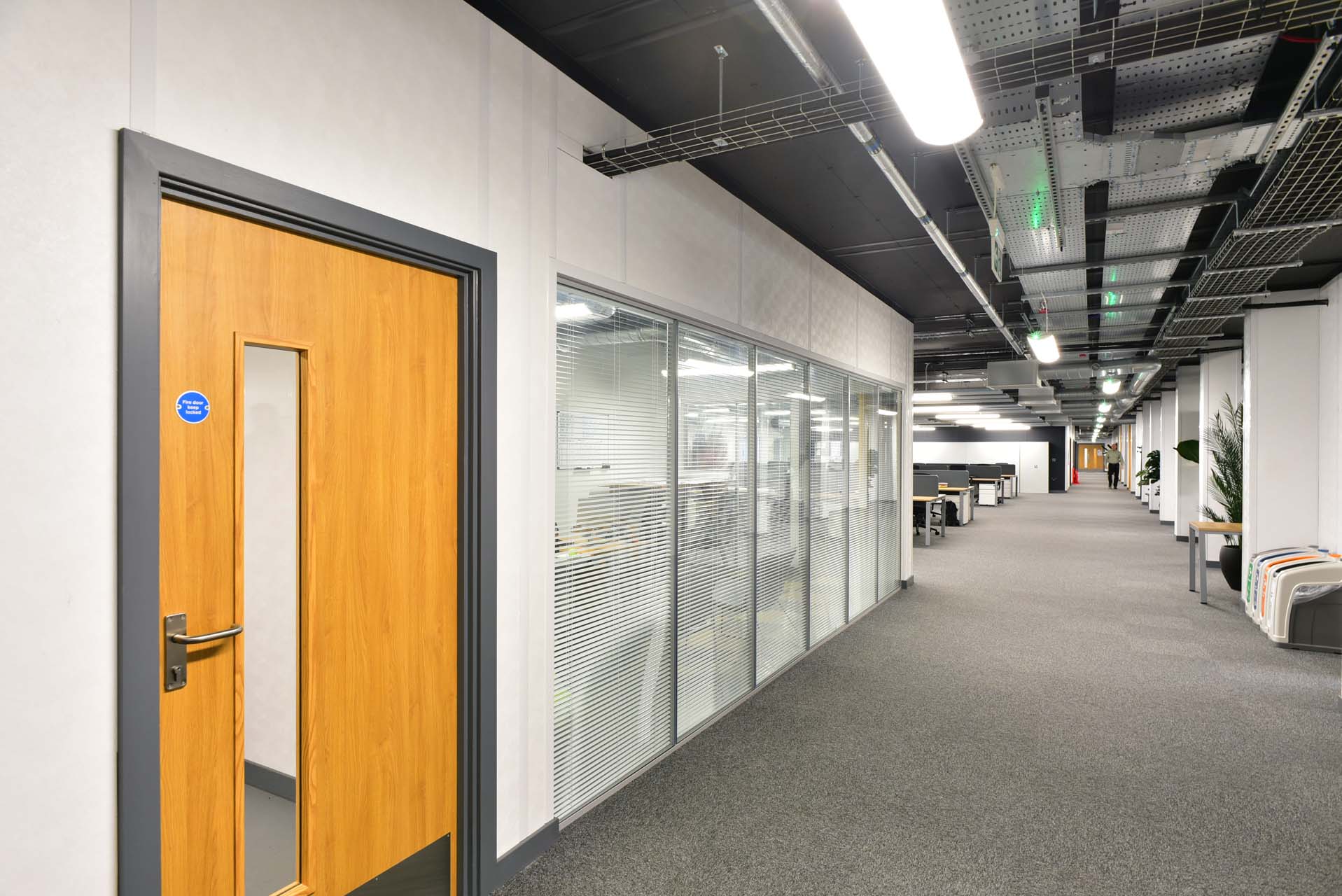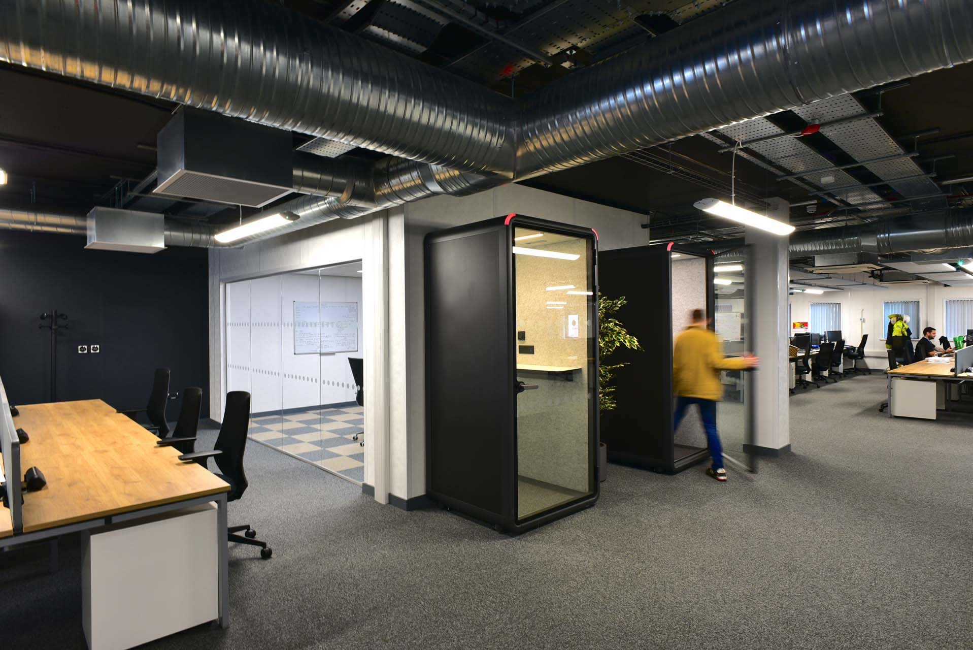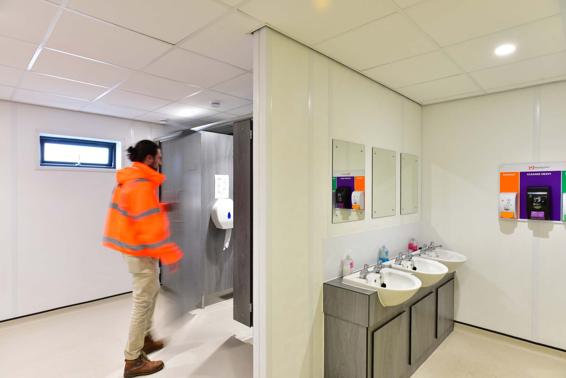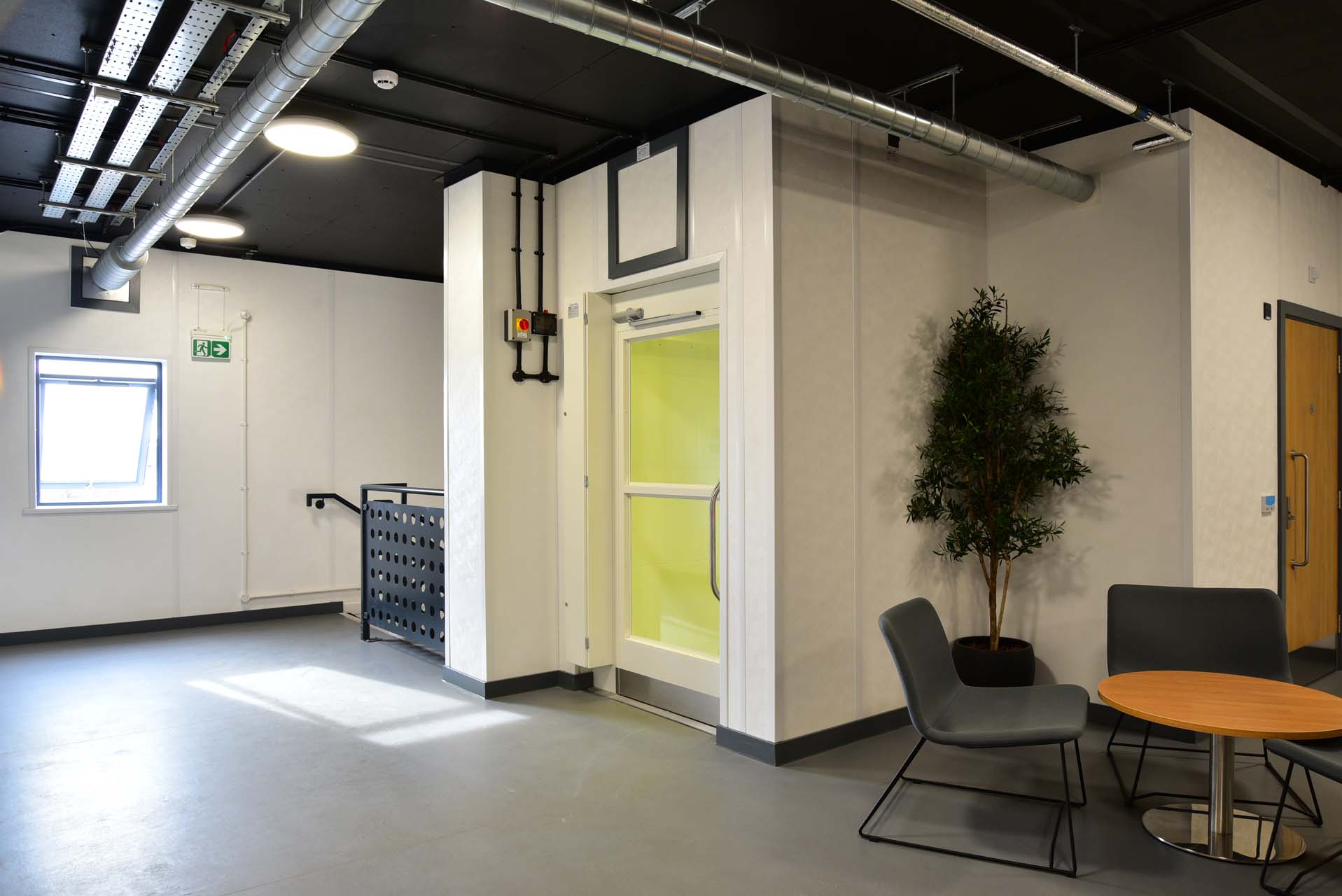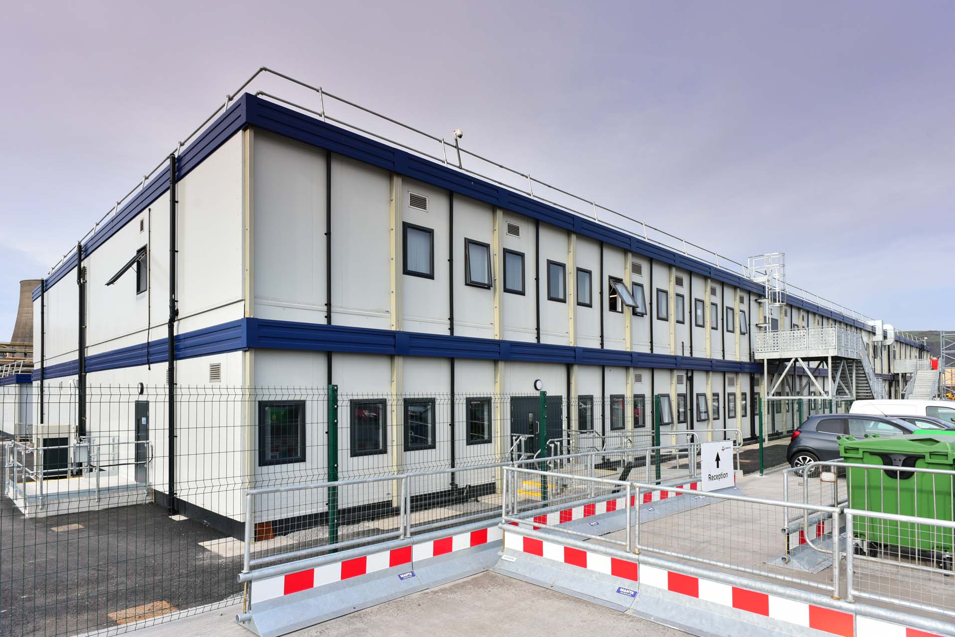 The buildings incorporated fire-rated internal doors, acoustic treatment to meeting spaces, non-slip flooring in welfare areas and robust finishes throughout. Mechanical and electrical systems were fully integrated, including heating, ventilation, lighting, fire alarms, data distribution and access control provisions.