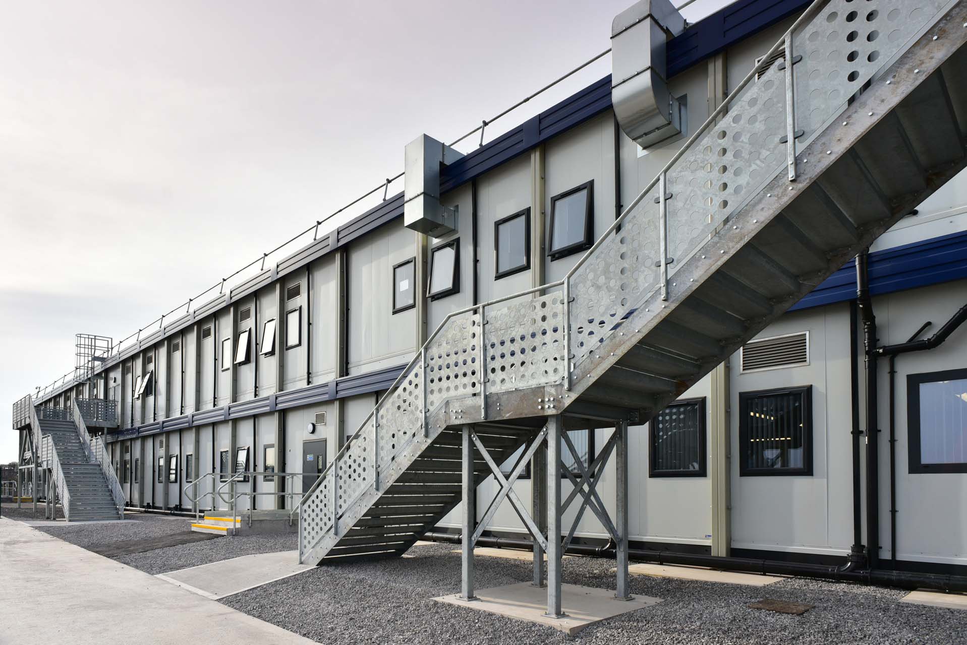 The project also required careful consideration of internal layouts, accessibility and user comfort, including lift access, acoustic performance, fire safety, ventilation and durable finishes suited to a high-traffic environment. Externally, the buildings needed to integrate within the operational Tata Steel site, with secure access, weather protection and provisions for future relocation and permanent installation, ensuring long-term value beyond the initial construction phase.